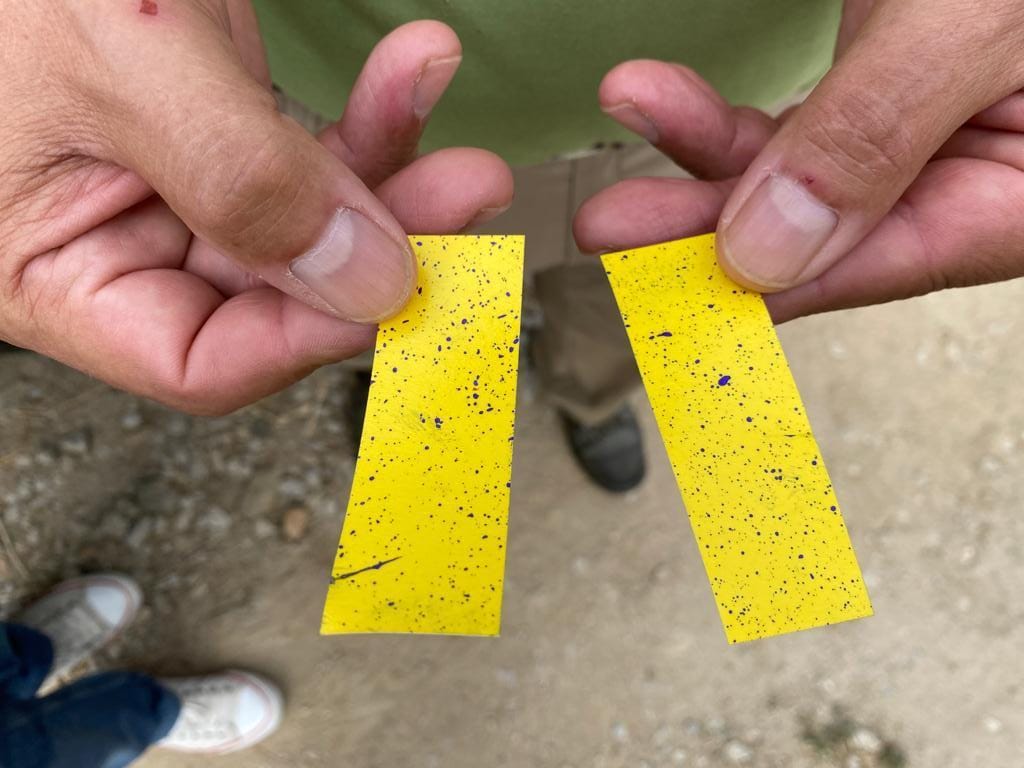 Realizamos pruebas de impacto por cm2 con papeles hidrosensibles. Los repartimos por distintas alturas de las cepas para que los viticultores pudieran comprobar la eficacia de la aplicación del producto desde uno de nuestros drones agrícolas, demostrando que una aplicación de 50 litros/ha es mas que suficiente para los viñedos, dado que los viticultores están acostumbrados a utilizar 1000 litros/ha en las aplicaciones manuales.